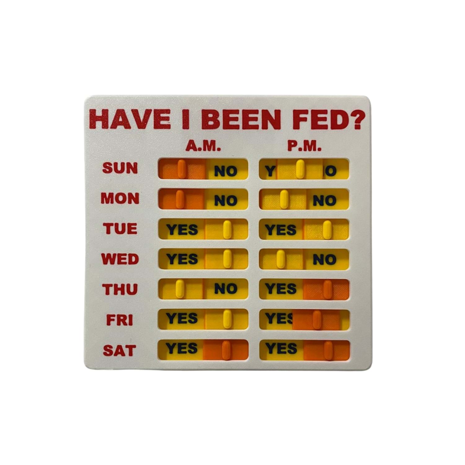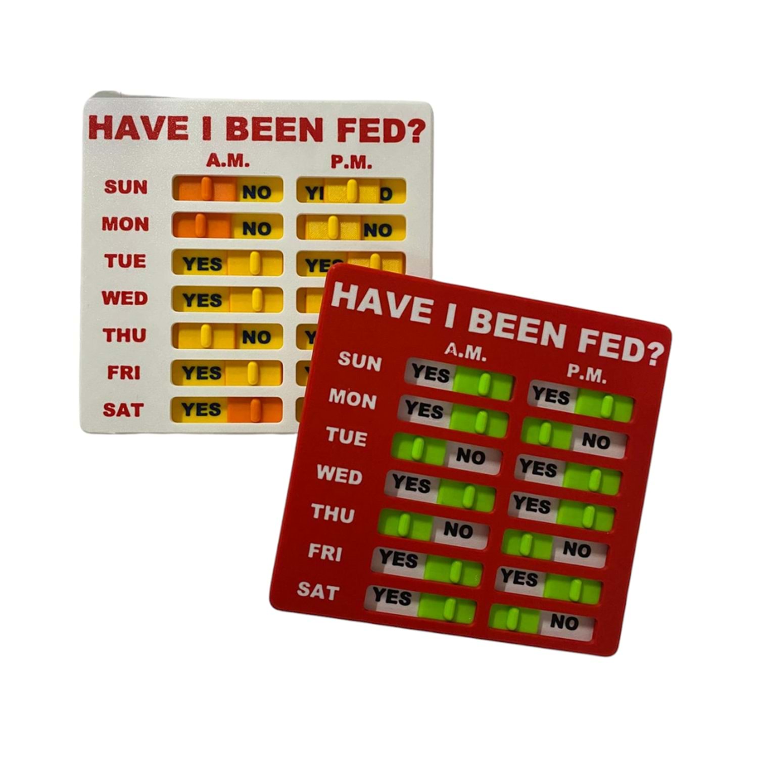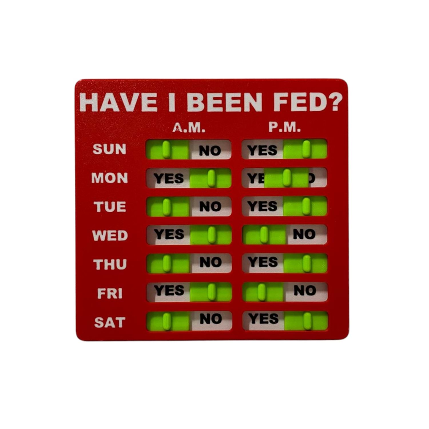 Evcil hayvan sahipleri ve aileleri için yararlı araç - hayatınızı kolaylaştırmak için mükemmeldir ve sizin ve ailenizin bir evcil hayvanın ne zaman beslendiğini belirtmesini sağlar. Kullanımı zor düğmeler veya talimatlar yok. Sadece evcil hayvanlarınızı besledikten sonra kaydırıcıyı hareket ettirin, ardından hafta sonunda hepsini geri kaydırın. ''Yes'' hayvanınızın beslendiği anlamına gelir. Aşırı beslemeyi veya yetersiz beslemeyi önler - evcil hayvanınızın günlük yemeklerini zaten bu günlük hatırlatma tablosu aracılığıyla yemiş olup olmadığını kolayca izleyebilirsiniz. Bu, ekstra veya kazara çift beslemeleri ortadan kaldırır.